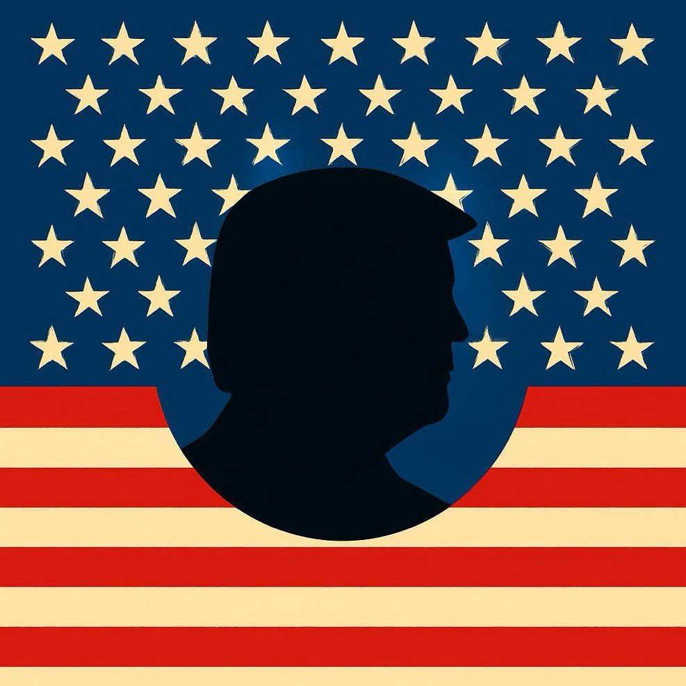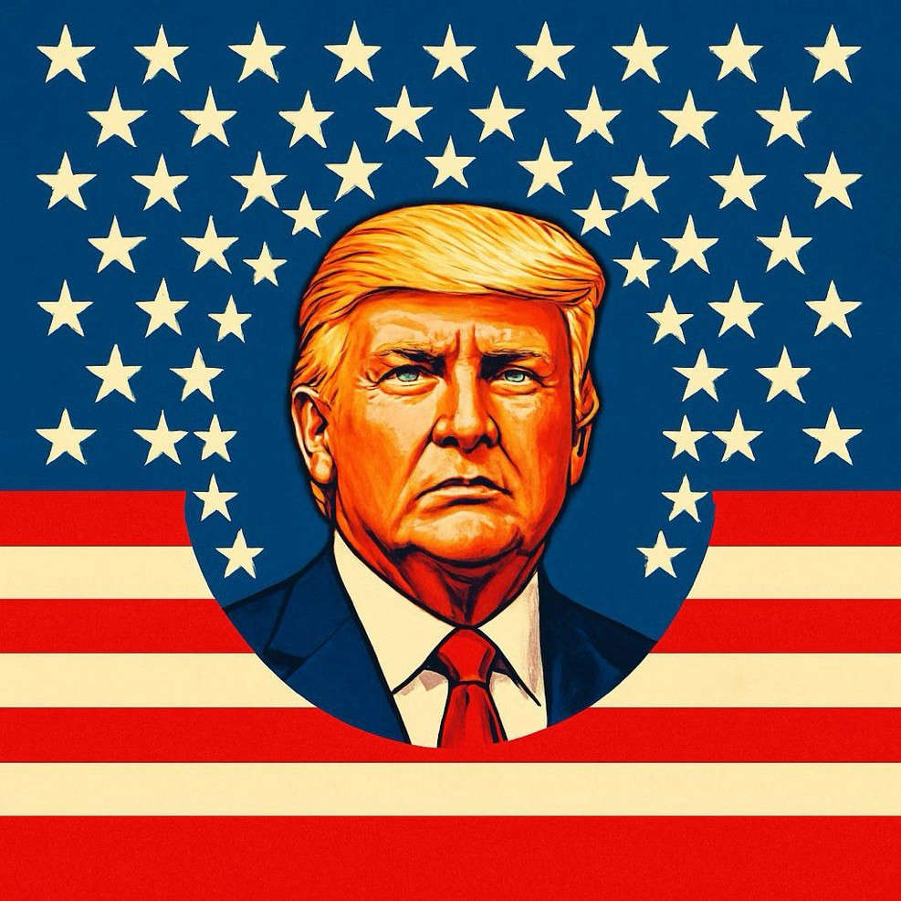 This concept leans heavily into symbolism, featuring an expanded field of stars alongside a faint silhouette of Trump across the stripes.
