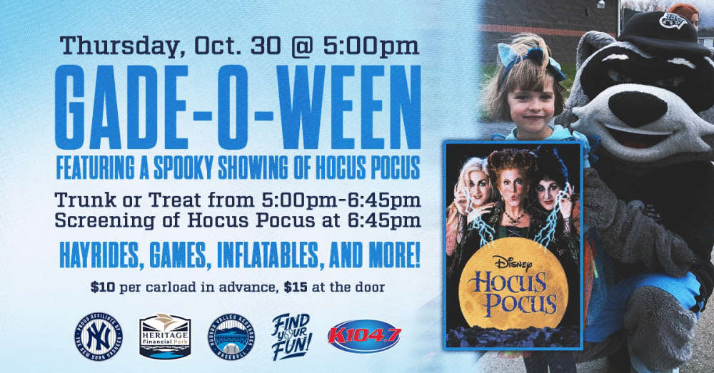 K104 & THE HUDSON VALLEY RENEGADES HAVE TEAMED UP FOR 'GADE-O-WEEN' ON THURSDAY, OCTOBER 30TH BEGINNING AT 5PM! K104'S SKYWALKER WILL BE BROADCASTING LIVE & K104'S JIMMY LYLES WILL BE DJING AT THE TRUNK OR TREAT FROM 5-7PM-- THEN WE MOVE INSIDE THE STADIUM FOR A SPECIAL SCREENING OF HOCUS POCUS!