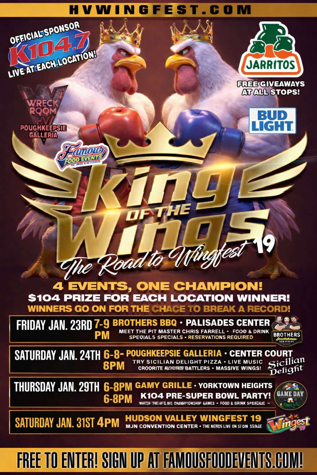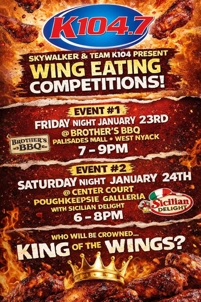 JOIN SKYWALKER & TEAM K104 ON FRIDAY (JANUARY 23RD) FROM 7-9PM AT BROTHER'S BBQ IN THE PALASADES MALL IN WEST NYACK FOR THE "KING OF THE WINGS" COMPETITON! WHOEVER EATS A DOZEN WINGS THE FASTEST WINS $104 AND MOVES ON TO THE FINALE AT HV WINGFEST 19!