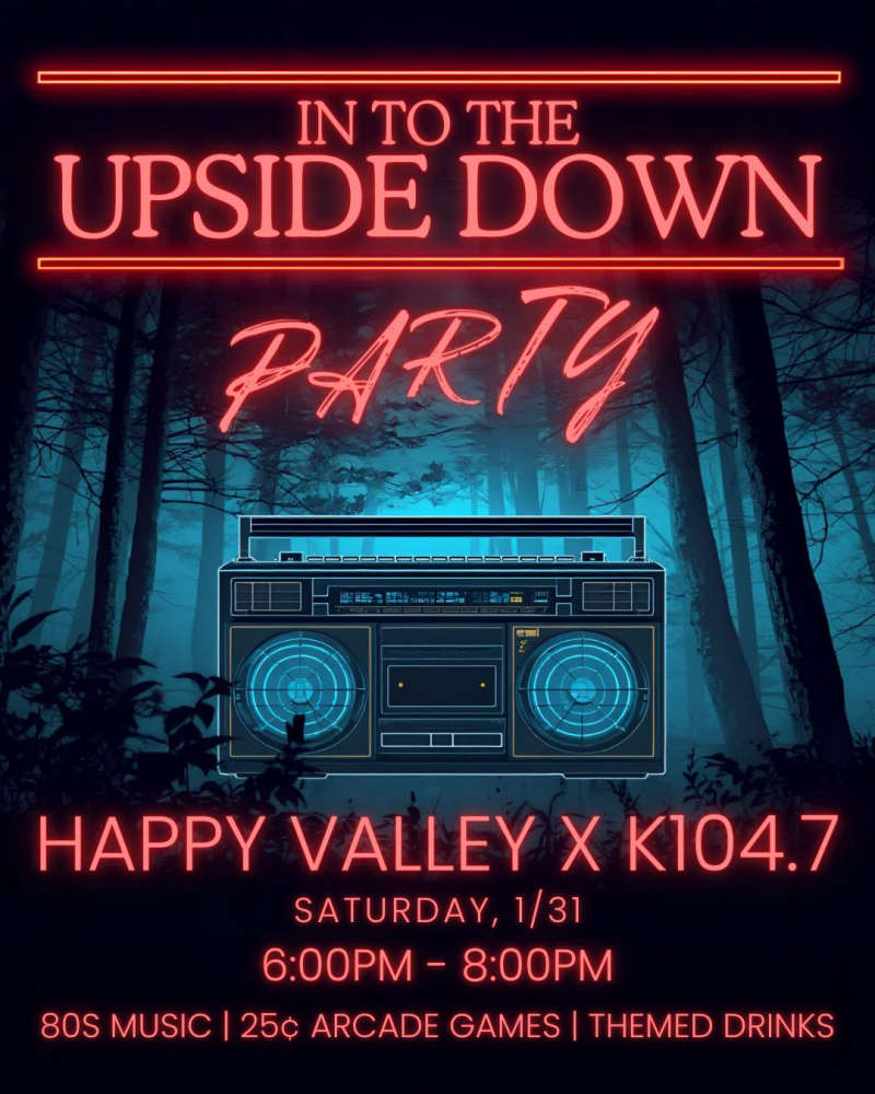 JOIN TEAM K104 ON SATURDAY (JANUARY 31ST) FROM 6-8PM AT HAPPY VALLEY ARCADE BAR ON MAIN STREET IN BEACON FOR OUR "INTO THE UPSIDE DOWN" PARTY-- WITH STRANGER THINGS THEMED DRINKS, 25 CENT RETRO ARCADE GAMES AND MORE!