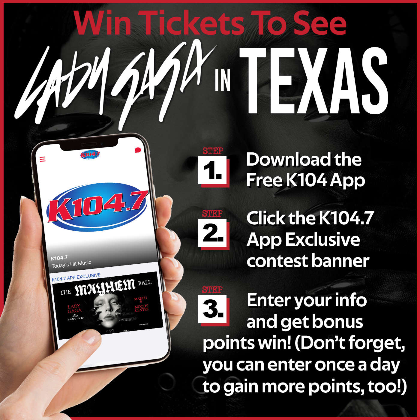 STEP 2: CLICK THE LADY GAGA BANNER ON THE K104 APP (BEGINNING JANUARY 19TH) TO ENTER FOR YOUR CHANCE TO SEE HER ON MARCH 8TH IN TEXAS!