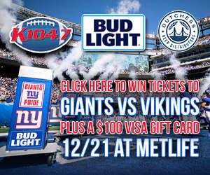 K104 has teamed up with Bud Light & Dutchess Beer to send you to see the Giants play the Vikings on December 21st at MetLife Stadium PLUS a $100 Visa Gift Card to cover your tailgating!
